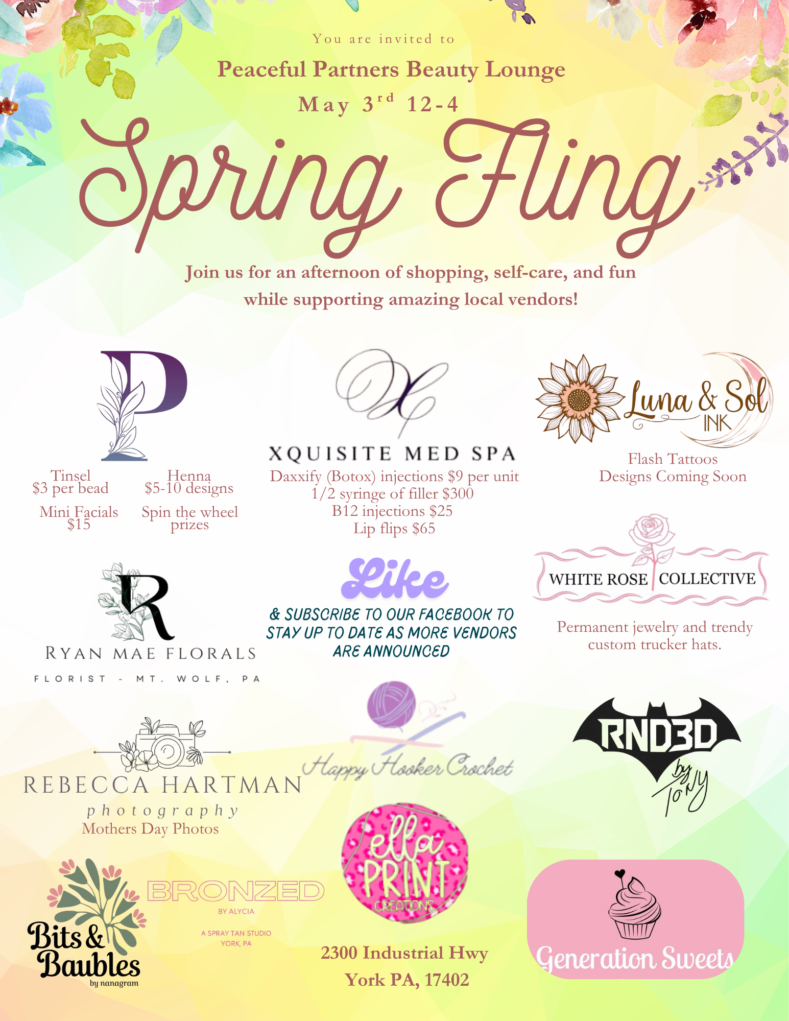 Spring is in full bloom, and we’re celebrating in the best way possible! Join us on Saturday, May 3rd from 12p-4p for our 2nd Annual Spring Fling at Peaceful Partners Beauty Lounge. This fun-filled event is the perfect way to welcome the season with beauty, shopping, self-care, and community all in one place.